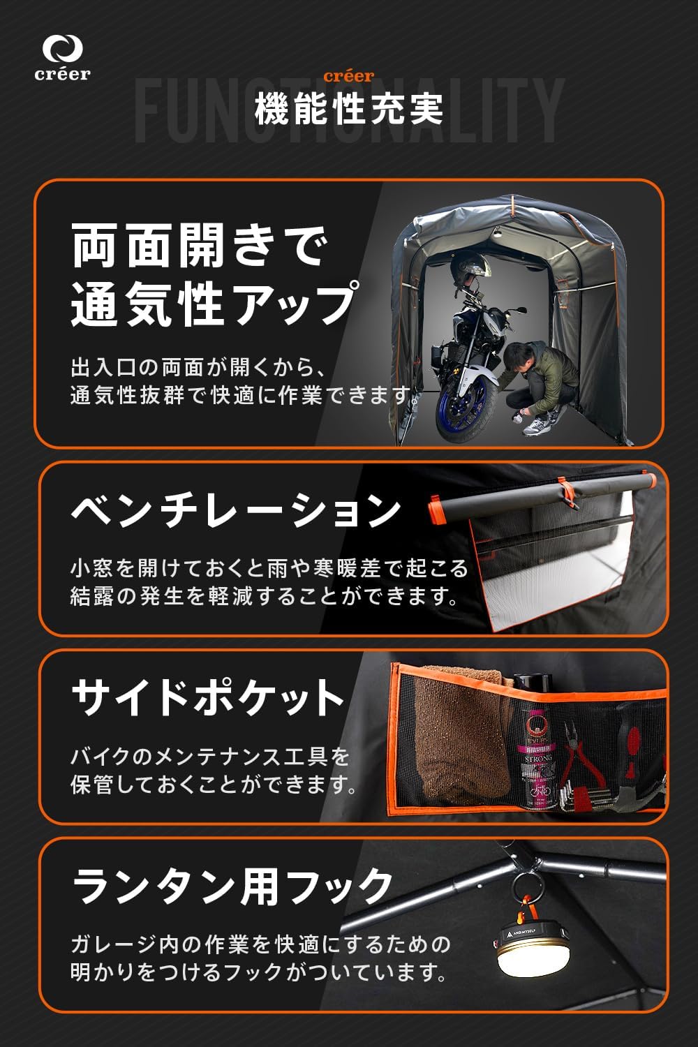 こちらのテントガレージは、サイズ展開が豊富かつ、ガレージ内で整備するときに便利な機能が備わっているのが特徴です。